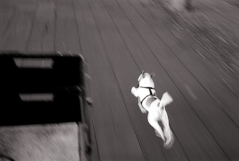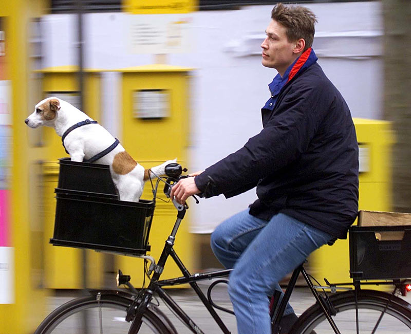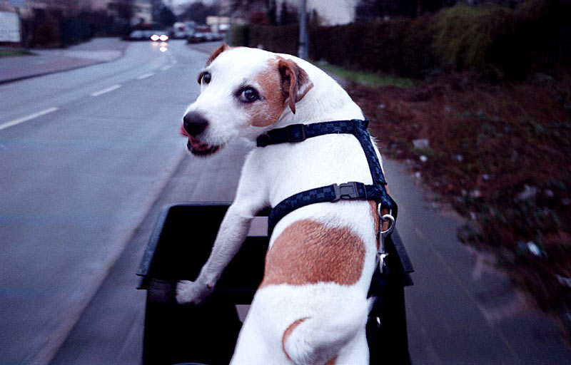 Enten, was ihm in der Regel aber nicht gelang. Relativ früh machte Gonzo auch Bekanntschaft mit Pferden. Das erste, das er von hinten angebellt hat, hat ihm mit dem Hufeisen Respekt eingeflößt. Früh konnte er mit dem Fahrrad mitfahren. Dabei stemmte er sich
